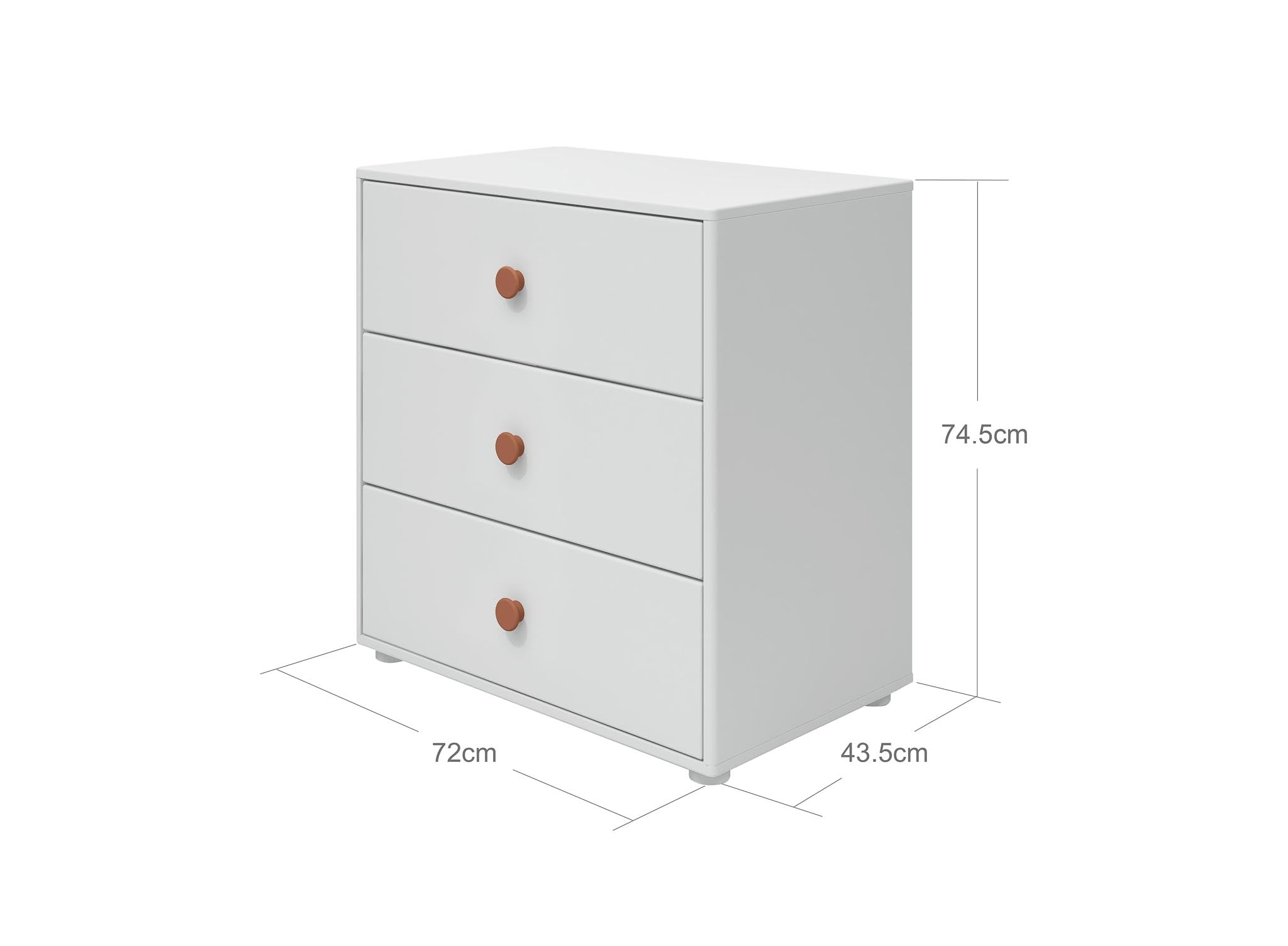 Roomie chest with three drawers. The chest comes with soft-close drawer runners and rounded wooden knobs in several different colour options. Fits under mid-high beds. Incl. adjustable feet. Made of certified MDF and HDF.