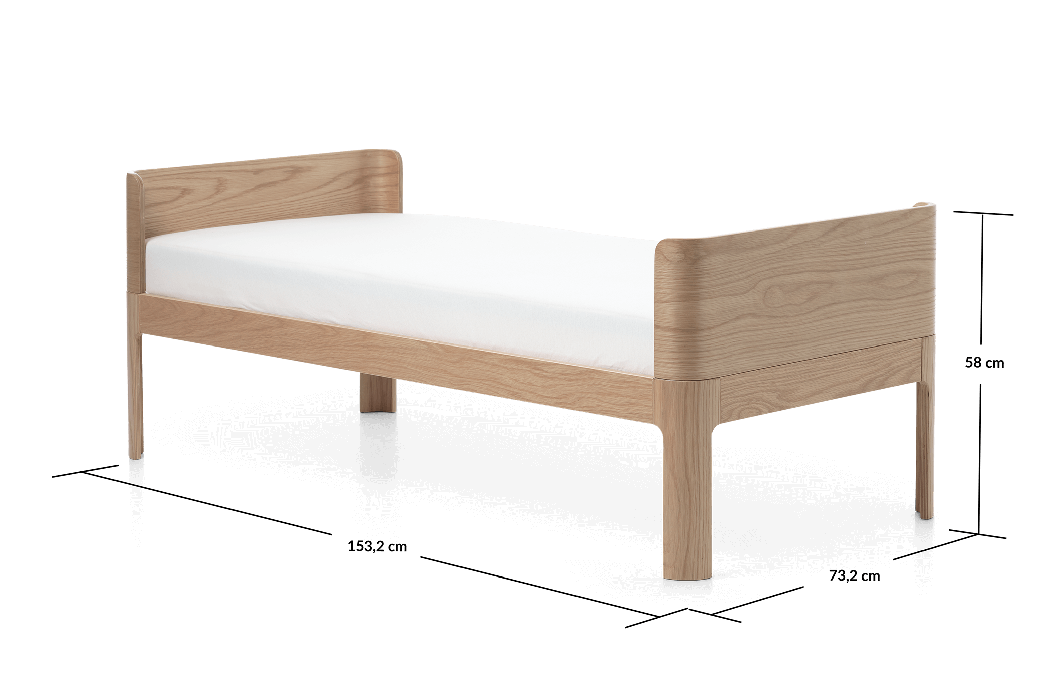 Small thoughtful details, such as the fine joinery and the legs’ continuing curve, make this junior bed stand out as a friendly and well-proportioned piece of furniture. The bed easily matches other design objects, colourful toys, and fine display items you keep in your nursery and the rest of your home.