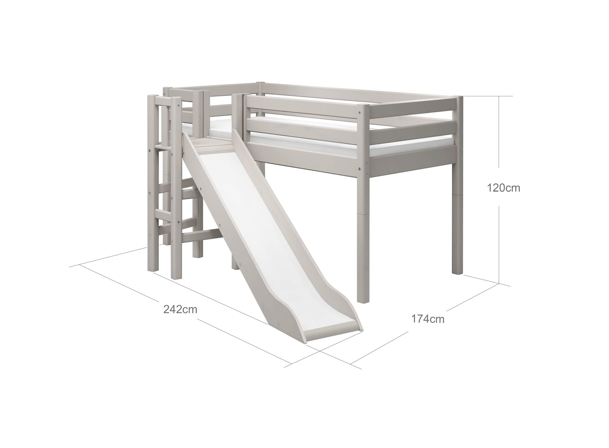CLASSIC mid-high bed with safety rail, platform and slide. The ladder has anti-slip steps and can be placed in both ends of the bed, just as the slide. Thereby you can easily form the bed after your child's needs. The space underneath the midsleeper is perfect for storage.