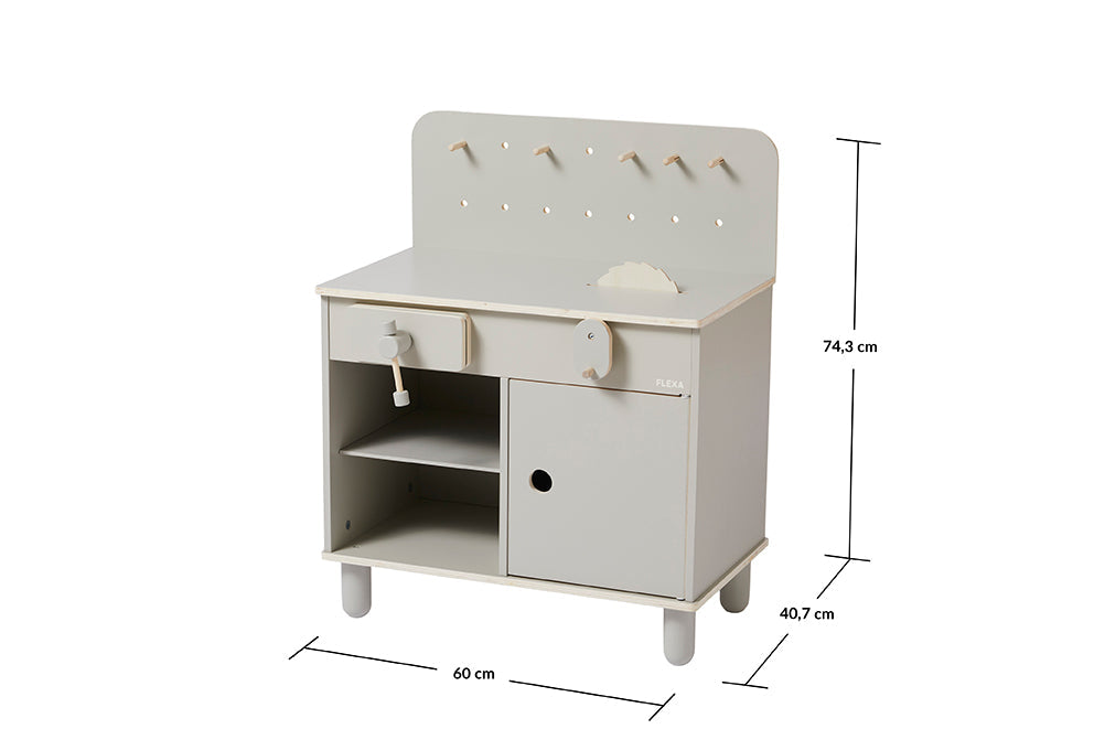 The Workbench includes a vice, a saw, shelves, and a cupboard. Made of high quality birch wood, plywood, and MDF. Made from FSC™ certified wood.