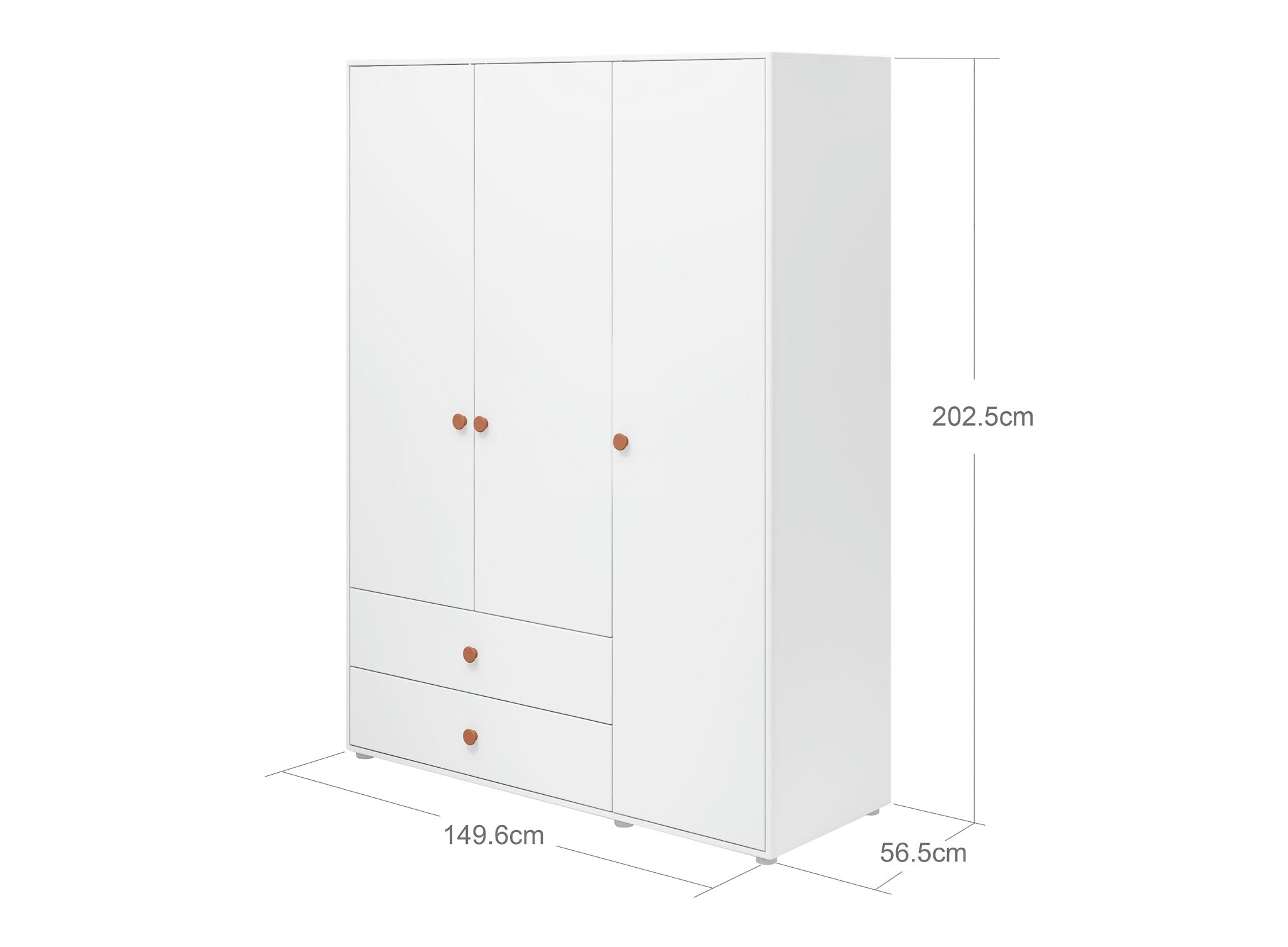 The Roomie wardrobe has three doors, two drawers, four shelves, and two hanger rails in solid oak. The wardrobe is timeless, Scandinavian design with smooth edges and soft-close to ensure that little fingers don't get stuck when opening and closing the doors and drawers. It's made of certified MDF and HDF, and it comes with adjustable shelves and rounded wooden knobs in several different colour options.